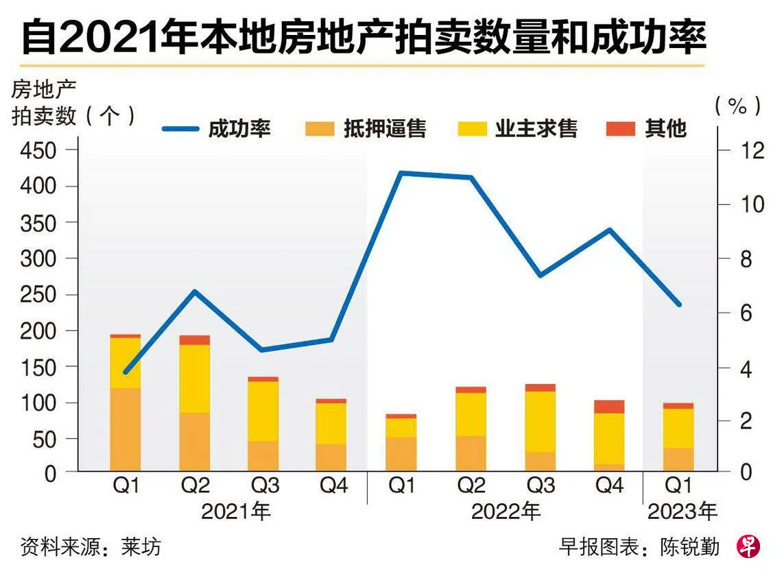 受商业环境疲软影响,虽然今年首季本地房地产拍卖数量比上季减少3%至96个,但抵押逼售(mortgagee sale)却增加了两倍多。分析师预计,随着本地更具挑战的商业环境,以及破产申请增加,下半年抵押逼售的房地产拍卖数量会有所增加。