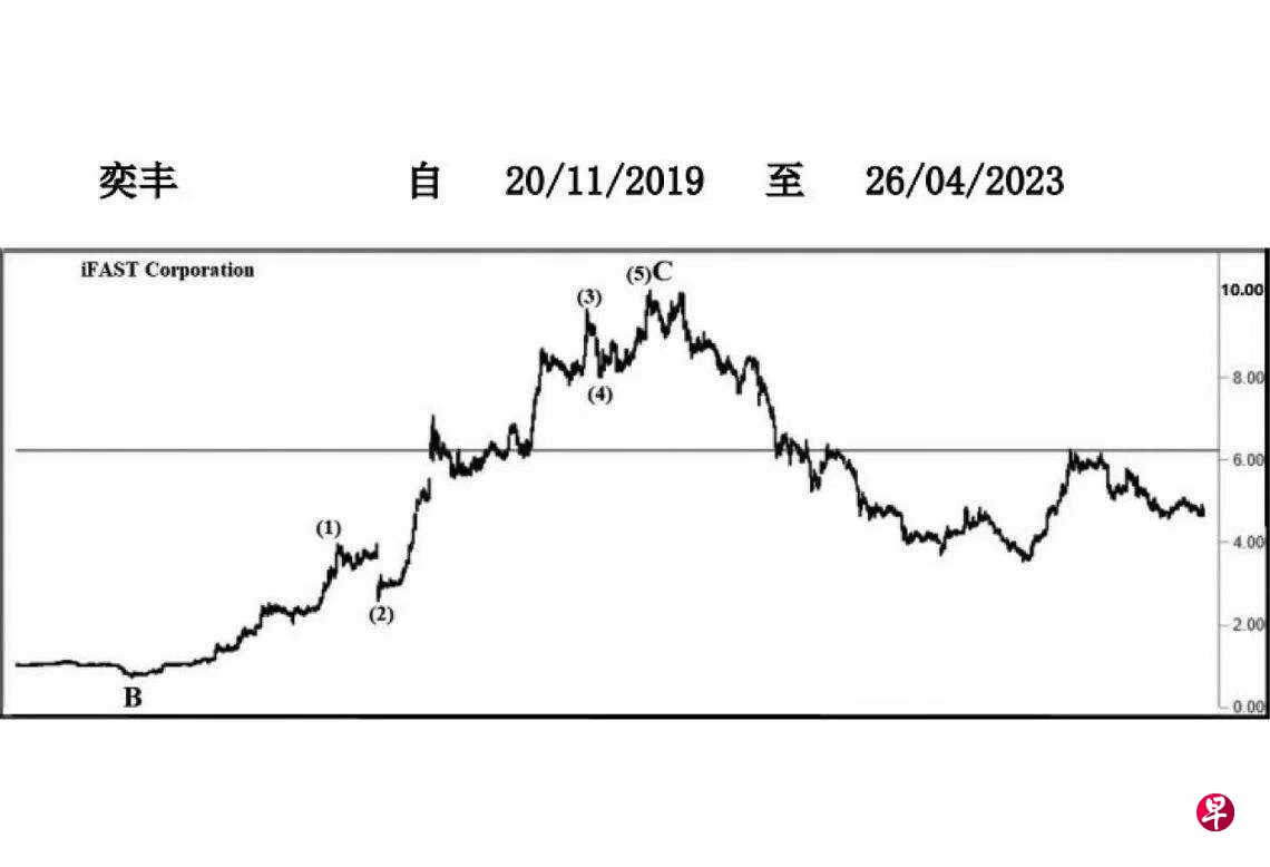 这只股票于2017年4月27日下试0.59元,并于其每周一杆图以“主要转向”信号进入三大波回扯,其中A大波又可分为三波。同年6月23日股价上升至1.17元完成了(a)波,过后回落至同年12月7日的0.85元,此为(b)波。2018年10月2日股价上升至1.22元,遂于其每周一杆图以“主要转向”信号结束了(c)波,同时为A大波画下句号。2020年3月23日股价下跌至0.715元,并于其每周一杆图以“转向”信号完成了B大波,旋进入具五波的C大波。同年10月27日股价上升至3.96元结束了第(1)波,接着回落至同年12月7日的2.58元,此为第(2)波。2021年7月14日股价上升至9.65元完成了第(3)波,同年7月28日股价下试8.00元结束了第(4)波。同年9月20日股价上升至10.10元,且于当天以“主要转向”信号完成了第(5)波。同时为C大波画下句号,随即进入调整。截至2022年10月17日股价已经下调至3.54元,估计短期内股价当升试6.05,不过,能否突破6.24元的阻力线,那就难以逆料。