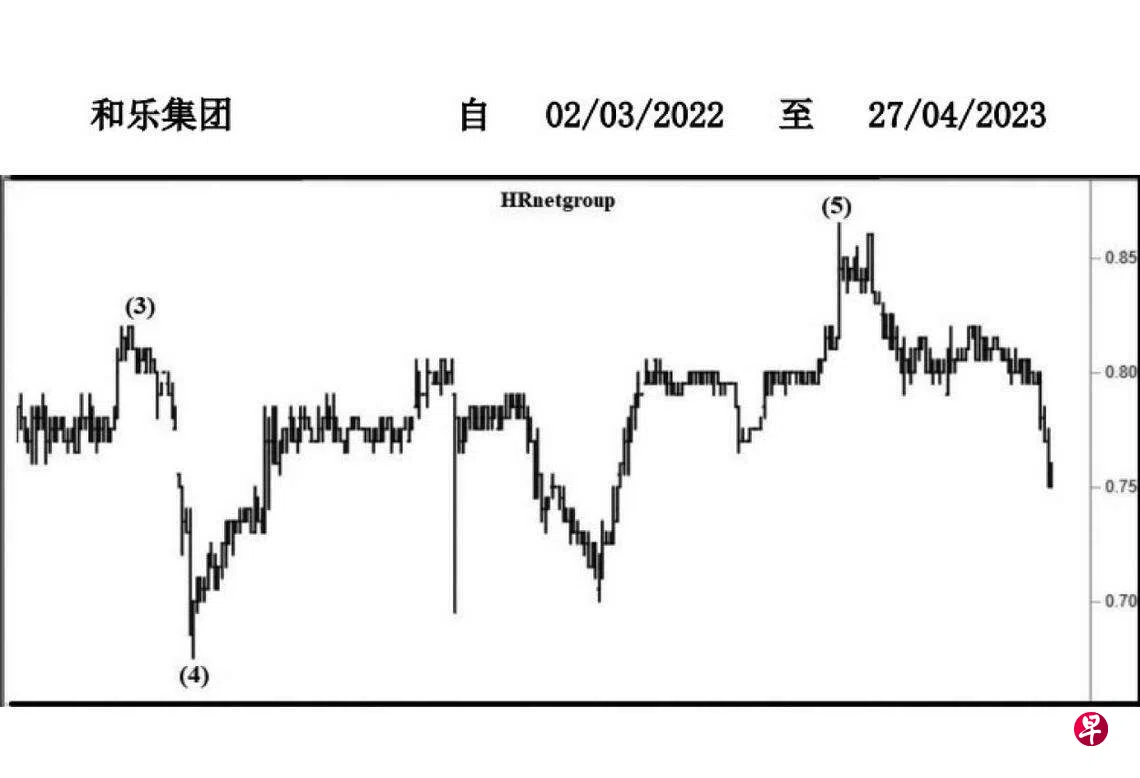 这只股票自2017年6月16日升试0.95元后,就以三波下跌,其中A波又具三波。2018年4月4日股价下跌至0.70元,旋于每月一杆图以“主要转向”信号完成A波。同年8月13日股价回扯至0.90元,又于当天以“主要转向“信号结束B波,随即进入具五波的C波跌势。2020年4月3日股价下探0.40元完成C波,并于每月一杆图以“转向”信号止跌回升。同年5月13日股价上升至0.53元,旋以“转向”信号结束第(1)波,过后回扯至同年9月11日的0.43元,此为第(2)波。几经反复,股价于2022年4月18日上升至0.82元,同时于每日及每周一杆图皆以“转向“信号完成第(3)波;接着回扯至同年5月13日的0.675元,随即于当天以”转向“信号结束第(4)波。今年2月2日股价升试0.865元,且于每月一杆图以“转向“信号完成第(5)波,遂进入三波调整。估计股价一旦跌穿0.675元的支撑点,当有骤跌,最终或将试0.575元的价位后,重返升势。