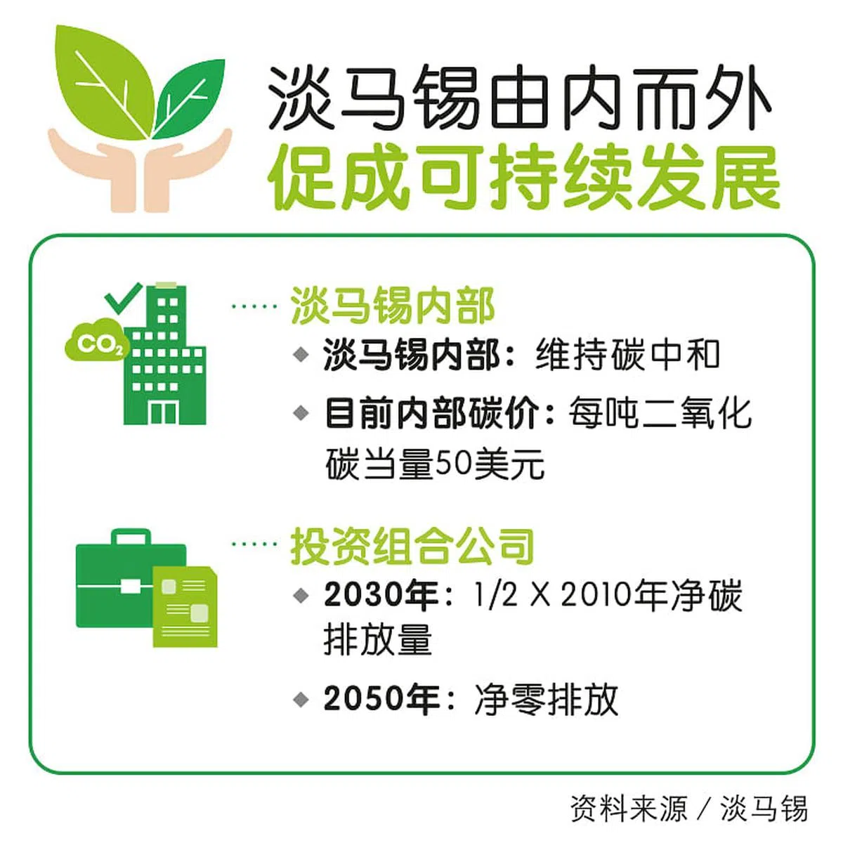 作为一家投资公司,淡马锡自2020年以来已实现碳中和(carbon neutrality), 并保持至今。至于对公司的投资组合,淡马锡的目标是到2030年将投资组合的净碳排放量减少到2010年排放水平的一半、2050年整体投资层面实现净零排放。