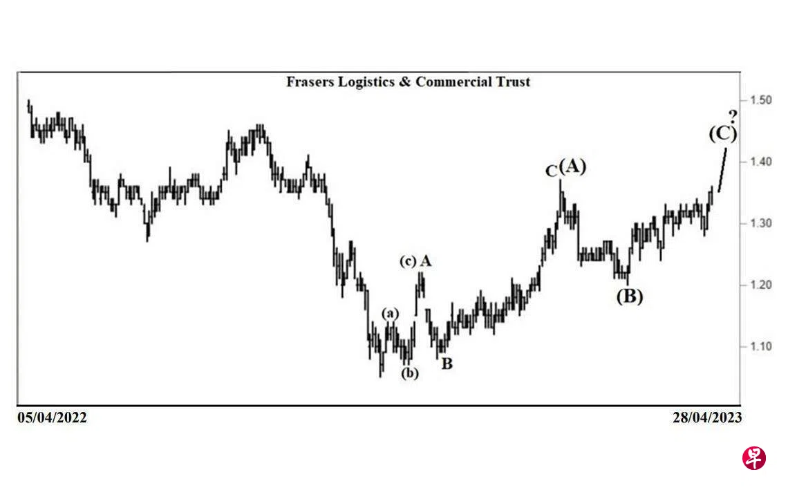 本栏于去年11月4日曾论及这只股票当时正处三波回扯,且可能升试1.27元的阻力线后,才重返跌势。当时股价为1.11元左右。见报当天股价下探1.07元,11月8日再度试此价位未果,立即完成了(b)波,遂进入(c)波升势;依此类推,股价已经在去年10月31日的1.14元结束了(a)波。11月11日股价骤升至1.20元,同时在1.15元与1.13元间留下缺口。11月14日股价升试1.22元,15日再试此价位未果,旋完成了(c)波,同时为A波画下句号。11月17日股价跳空下试1.14元,同时在介于1.16元与1.19元间留下缺口。11月18日股价下跌至1.12元,遂将上述第一个缺口填补。11月23日股价下探1.08元结束了B波。同年12月16日股价上升至1.19元,旋将上述第二个缺口填补。今年1月26日股价向上突破上述位于1.27元的阻力线,2月3日更直试1.37元完成了C波,同时为(A)波画下句号。3月13日股价回落至1.20元,此为(B)波。估计股价当升逾1.37元的价位,以完成(C)波,才重返跌势。