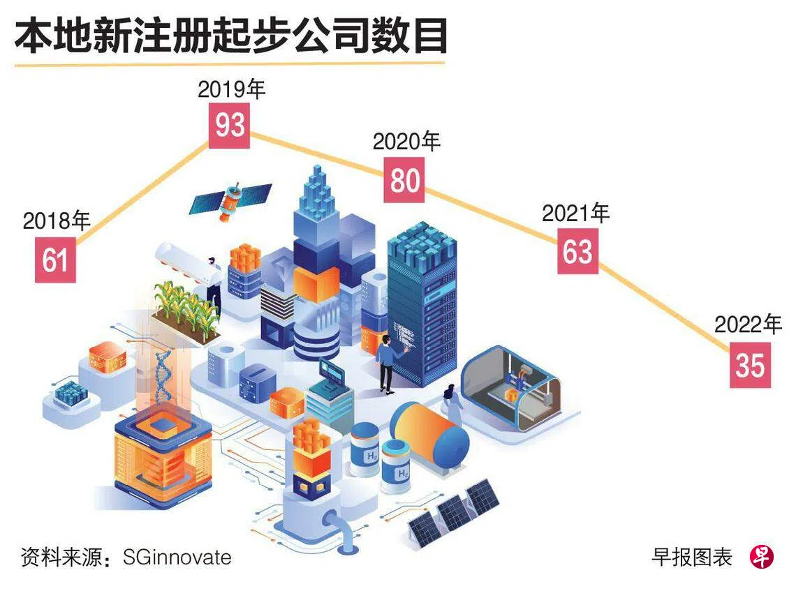 根据新加坡创新机构(SGInnovate)的初创科技起步公司报告,本地注册的科技起步公司在2019年达到93家的峰值后,近几年来注册数目有所缓和,在2021年仅为63家,去年更跌至35家,为五年来新低。