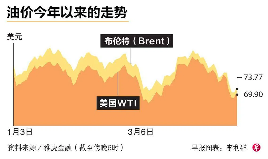 截至星期五(5月5日)傍晚6时,布伦特原油期货价格和美国WTI原油期货价格分别报73.77美元和69.90美元,过去三个星期已下挫超过10%。