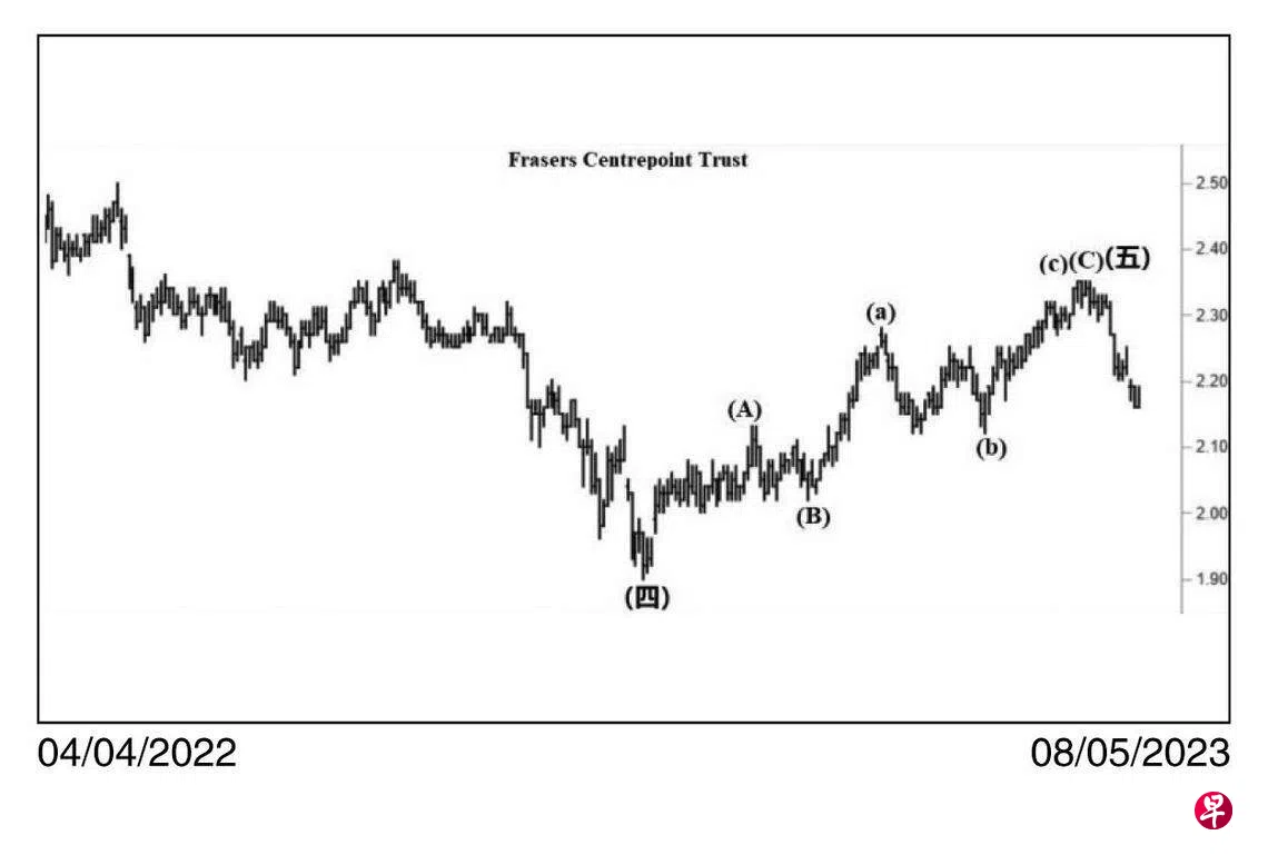 本栏于2022年11月11日曾预估这只股票于11月8日股价下探1.90元为上图中的第(四)点画下句号;短期回扯,股价或将试位于2.17元的阻力线后,才重返跌势。当时股价为1.95元左右。见报当天股价骤然上升至2.04元,12月15日股价上升至2.13元,16日再试此价位未果。遂于当天以“转向”信号完成上图中的(A)波,接着以三细波回扯至2023年元月6日的2.02元,此为(B)波,过后 进入具三波的(C)波。元月20日股价上升突破上述位于2.17元的阻力线,2月3日更升试2.28元结束了(a)波,3月13日股价下探2.12元未果,旋以“转向”信号完成了(b)波,4月14日股价升试2.35元,19日第四度试此价位未果,遂以“主要转向”信号结束了(c)波,同时为(C)波画下句号,也成就了一个源自2020年9月8日从2,73元下跌以来“斜向交叉”的第(五)点。因此,若以其2021年2月3日位于2.66元的第(三)点及上述的第(四)点价差,计自第(五)点,可测得目标为1.59元。