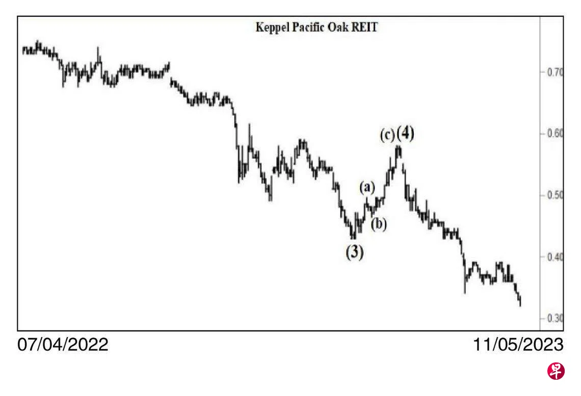 本栏于去年12月24日曾论及这只股票短期回扯,充其量也只能填补介于0.615元与0.625元的缺口,过后当跌穿0.39元的支撑点了。当时股价为0.45元左右。同年12月27日股价下试0.43元,29日股价第三度试此价位未果,遂以“主要转向”信号完成了一个源自去年元月4日从0.81元下跌以来,C 波中的第(3)波,接着进入具三波的第(4)波回扯。今年元月9日股价上升至0.495元结束了上图中的(a)波,过后回落至元月12日的0.465元,此为(b)波,接着以五细波一路挺升至2月3日的0.58元。6日股价再试此价位未果,遂完成了(c)波,同时为第(4)波画下句号,旋进入第(5)波跌势。2月8日股价下跌至0.535元,同时在介于0.55元与0.57元间留下缺口,随即缓缓下滑。3月28日股价终于跌穿上述的0.39元的支撑点,直探0.34元,截至5月11日股价已经下跌至0.32元。由于其“动力”信号开始筑底,估计跌幅将日渐趋缓。