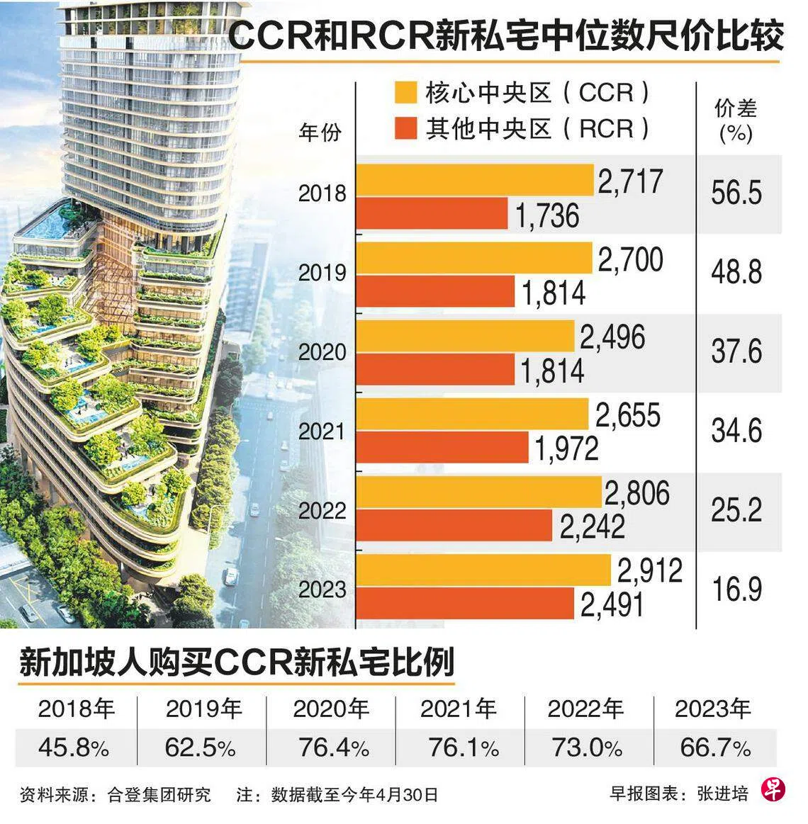 根据合登集团(Huttons)研究提供给《联合早报》的数据显示,在冠病疫情前,代表高档私宅的核心中央区(CCR)的新项目中位数尺价从2018年的2717元,在今年4月底上升至2912元,涨幅约7%。相比之下,同时期代表中档私宅的其他中央区(RCR)的中位数尺价则从1736元上升至2491元,涨幅达30%。