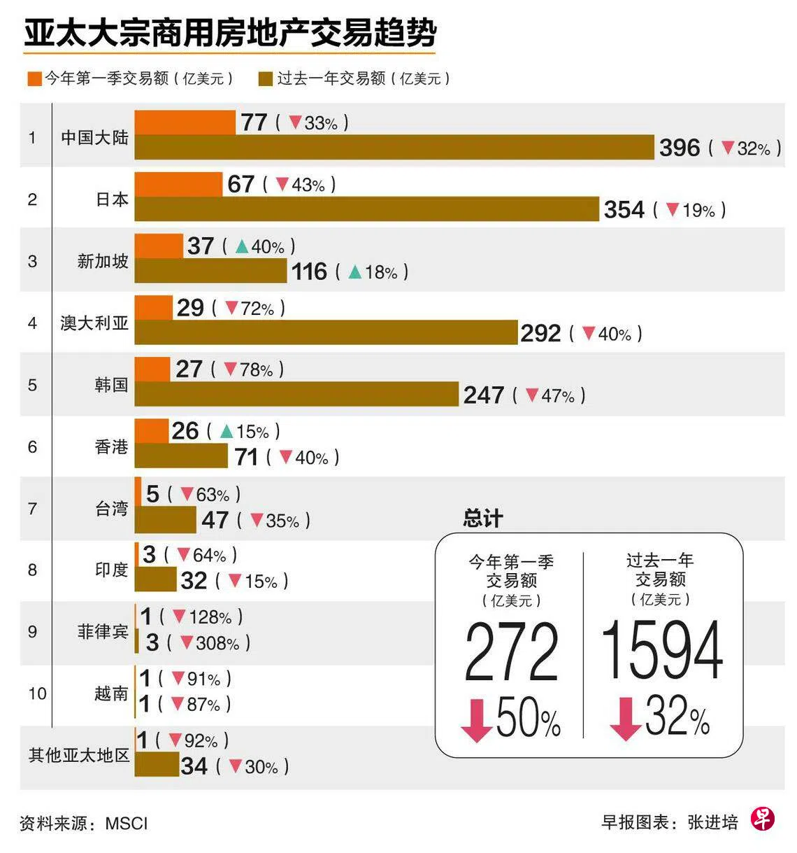 MSCI旗下的MSCI Real Assets最新发布的第一季亚太商用房地产报告显示,亚太大宗商用房地产总交易额在第一季同比下跌50%,只达272亿美元(约361亿新元),过去一年总交易额则下跌32%至594亿美元。