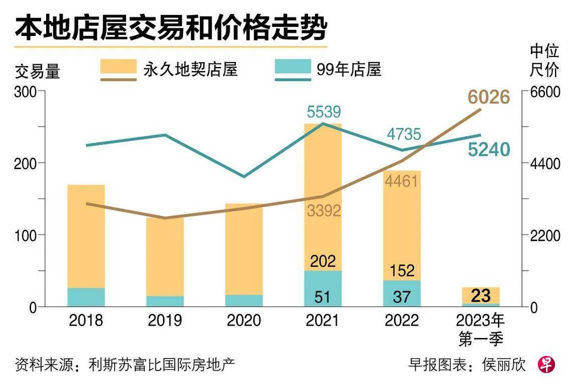 2021年店屋交易额达19亿多元,每平方英尺价为4253元。2022年的交易额减少至16亿多元,尺价则上升至4787元。到了今年第一季,28宗交易共2亿7700万元,每平方英尺价格大幅飙升至5427元。