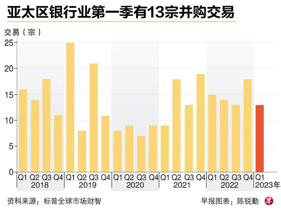 今年第一季亚太区有13宗银行业并购交易,低于去年同期的15宗。中国经济重新开放后,本区域银行业的并购交易有望在下半年复苏。