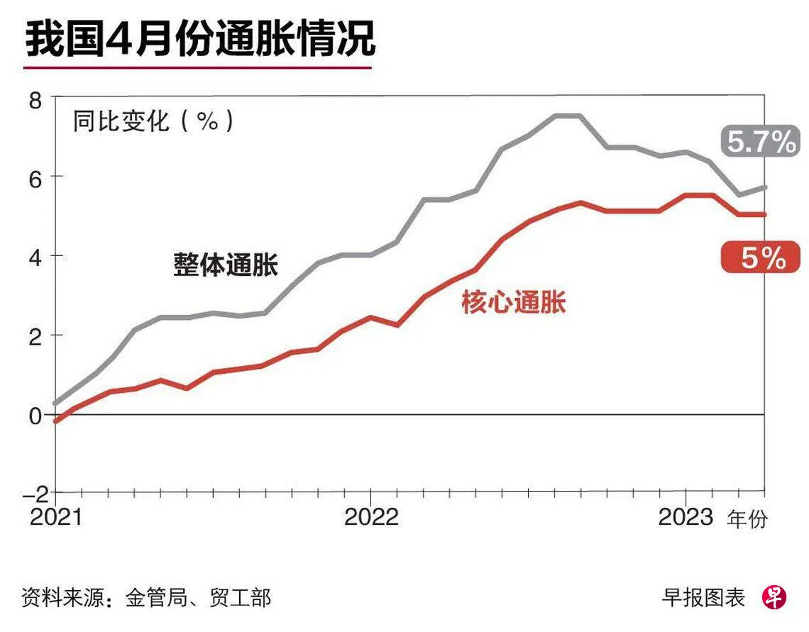 若看环比情况,本地核心通胀在4月微涨0.4个百分点,主要是旅行费用和机票价格更高。整体通胀也微升0.1个百分点,因为核心通胀更高和私人交通费上升。