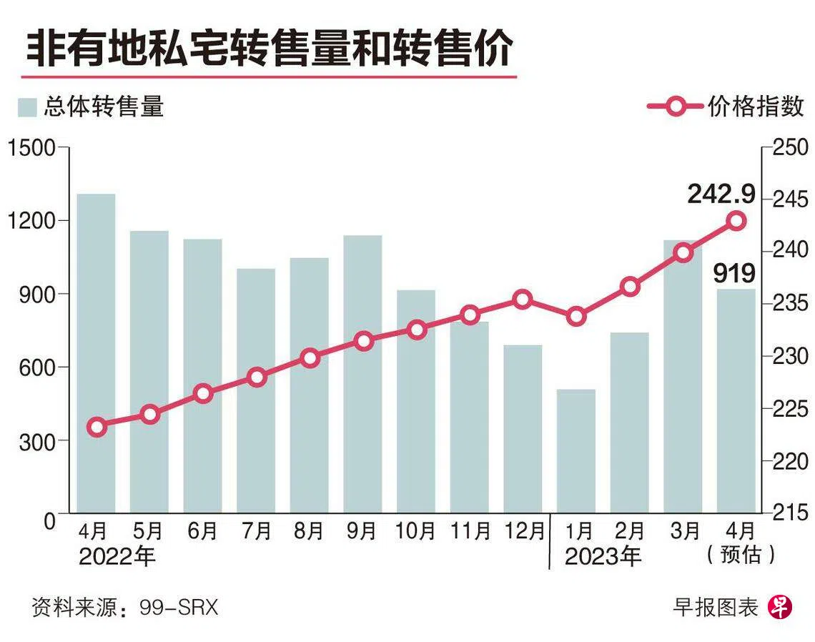 由于转售私宅供应趋紧,4月份本地非有地私宅的转售价继续获得支撑,整体转售价环比上扬1.2%,但销量则因为降温措施而趋缓,环比下跌17.9%。