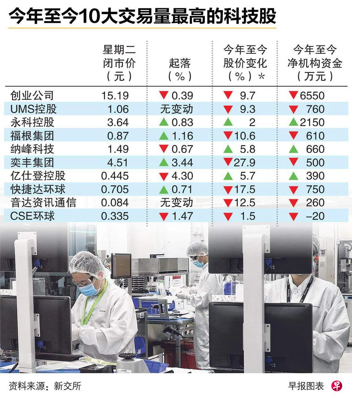 根据新加坡交易所(SGX)的最新报告,本地交易量最高的10大科技股中,只有永科控股(AEM Holdings)、纳峰科技(Nanofilm)和亿仕登控股(ISDN Holdings)今年至今的股价上涨,涨幅介于2%至5.8%。其余公司的股价均下跌,跌幅介于1.5%至27.9%。
