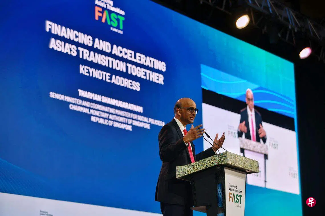 国务资政兼社会政策统筹部长尚达曼星期四(6月8日)上午在淡马锡主办的第九届生态繁荣周(Ecosperity Week)活动上发表主旨演讲时,谈到亚洲落实去碳目标的各项挑战。