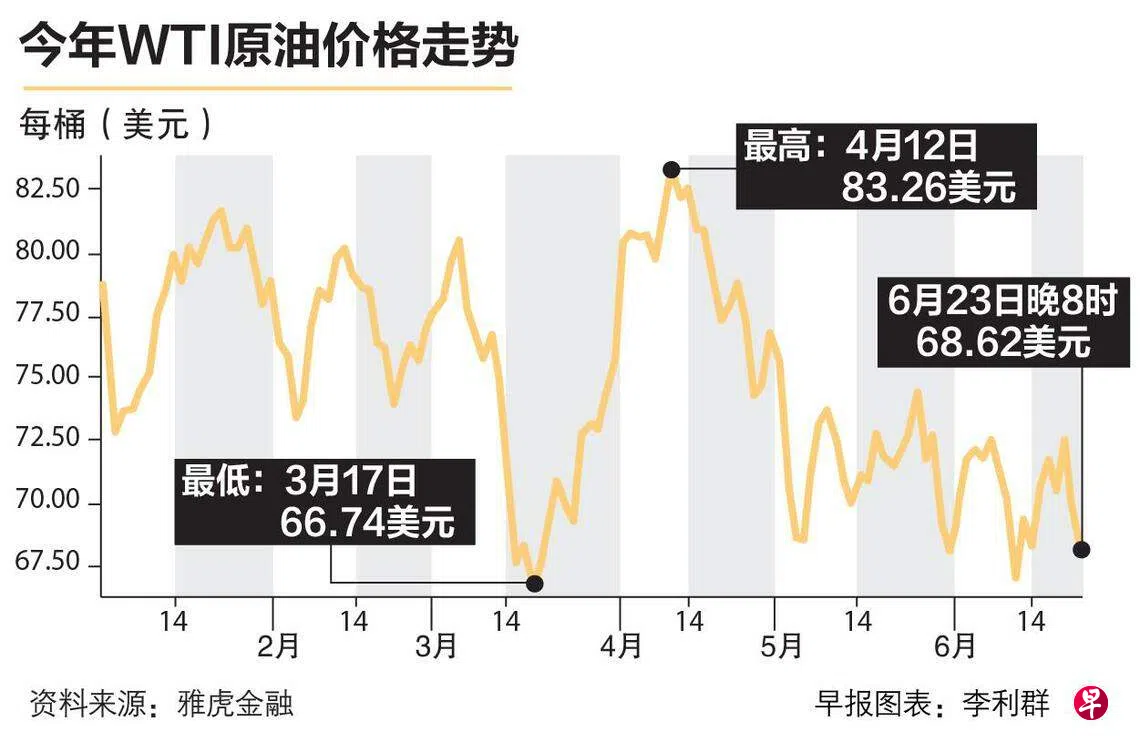 布伦特原油期货价格从星期三(6月21日)每桶76.23美元,下跌4.3%至星期五(23日)截稿时的每桶72.93美元。同期,WTI原油期货价格则从每桶72.53美元下滑5.4%至每桶68.62美元。