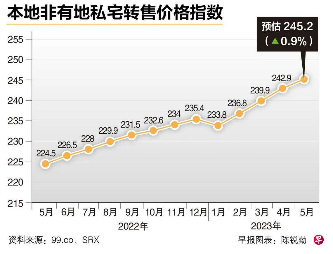 房地产网站99.co和新加坡房地产联合交易网SRX星期二(6月27日)发布的预估数据显示,本地非有地私宅的转售价连续四个月攀升,同比上涨9.2%。