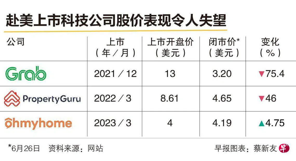 其中Grab和PropertyGuru自上市以来,股价下跌了75%和46%。截至星期一(6月26日)闭市报3.20美元和4.65美元。