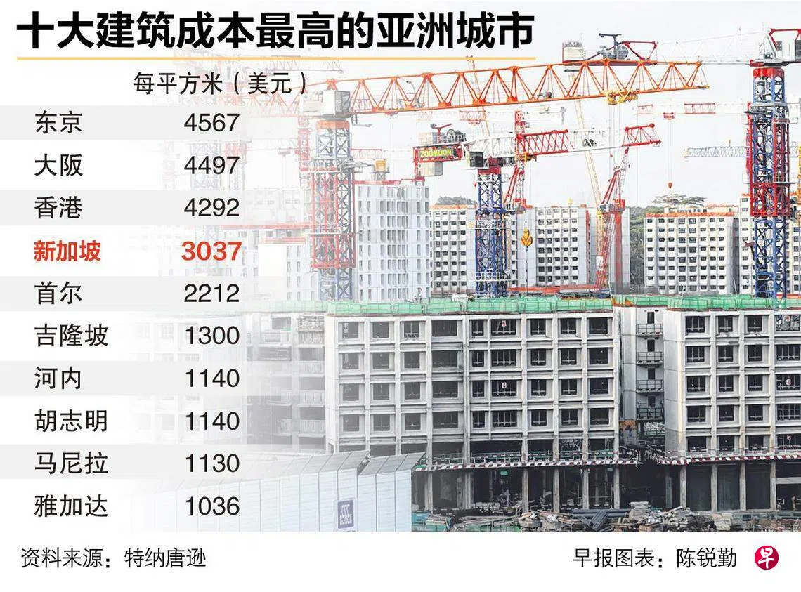 建筑咨询公司特纳唐逊(Turner & Townsend)星期一(6月26日)发表的《2023年国际建筑业市场调查》报告显示,在10大建筑成本最高的亚洲城市中,新加坡排名第四,平均成本为每平方米3037美元(约4100新元)。东京是建筑成本最高的亚洲城市,平均成本为每平方米4567美元。