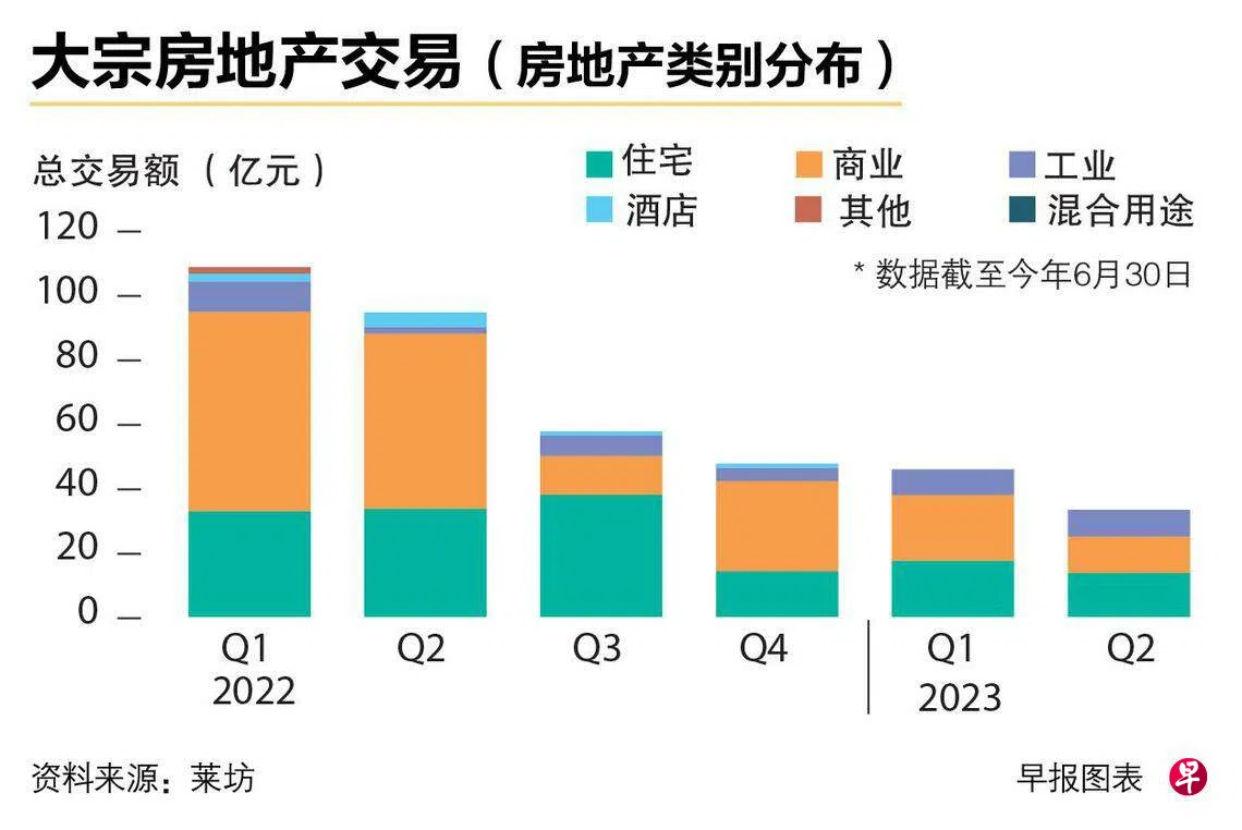 经济前景不明朗和地缘政治紧张情况持续,投资者在第二季继续保持观望态度,导致大宗房地产交易明显放缓,预估交易总额达32亿元,环比下跌29.4%,同比的跌幅更达66.1%。