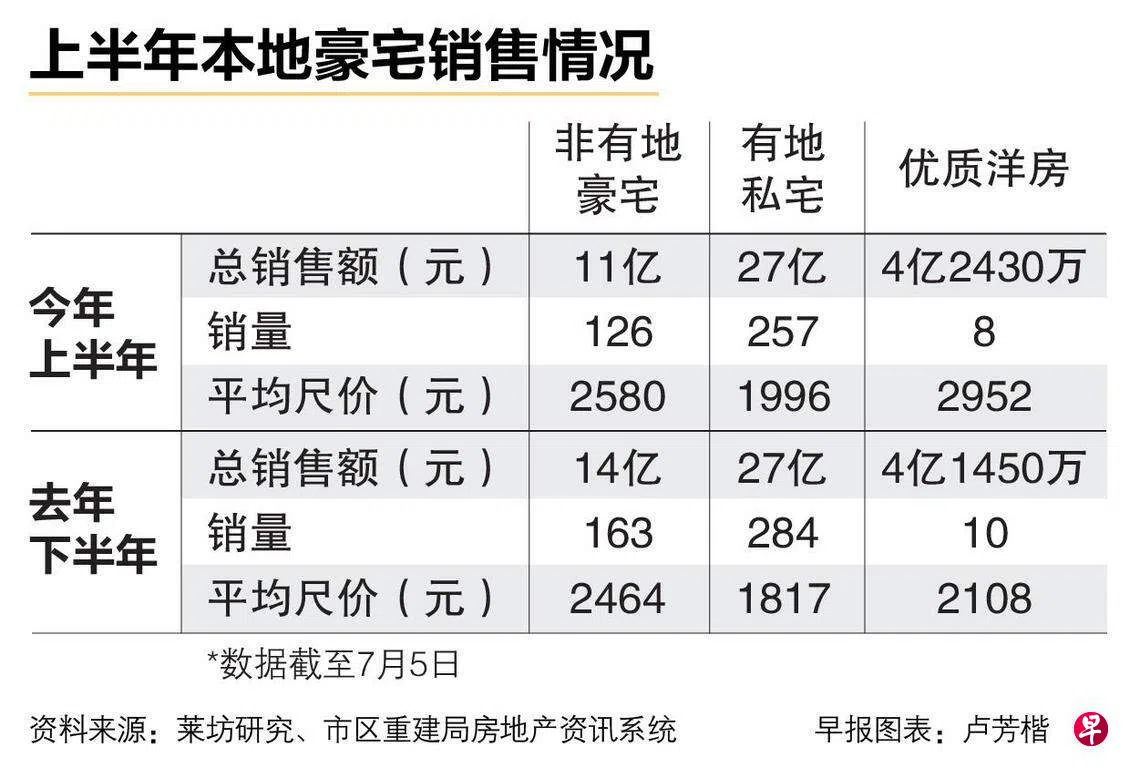 根据莱坊星期一(7月10日)发布的最新报告,上半年本地非有地豪宅总销售额比去年下半年下降23%至11亿元,售出单位从去年下半年的163个减少至126个。不过,销售平均尺价却从每平方英尺2464元上涨至2580元。