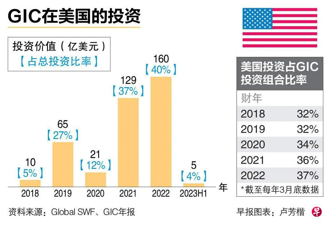 全球主权财富基金数据平台(Global SWF)董事经理洛佩兹(Diego Lopez)提供给《联合早报》的数据显示,以投资价值来看,GIC在美国的投资占比估计从2018年的5%增加到2022年的40%,去年投资额为160亿美元(211亿新元);从投资项目的数量看,比率从2018年的14%增长到2022年的29%。