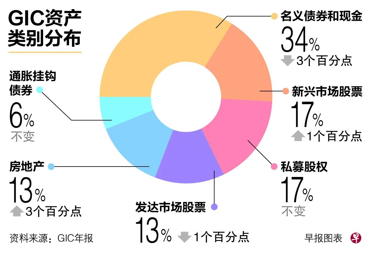 截至今年3月底,GIC的私募股权投资占比维持在17%,债券和现金占比34%,比一年前减少三个百分点,房地产投资上升三个百分点至13%。