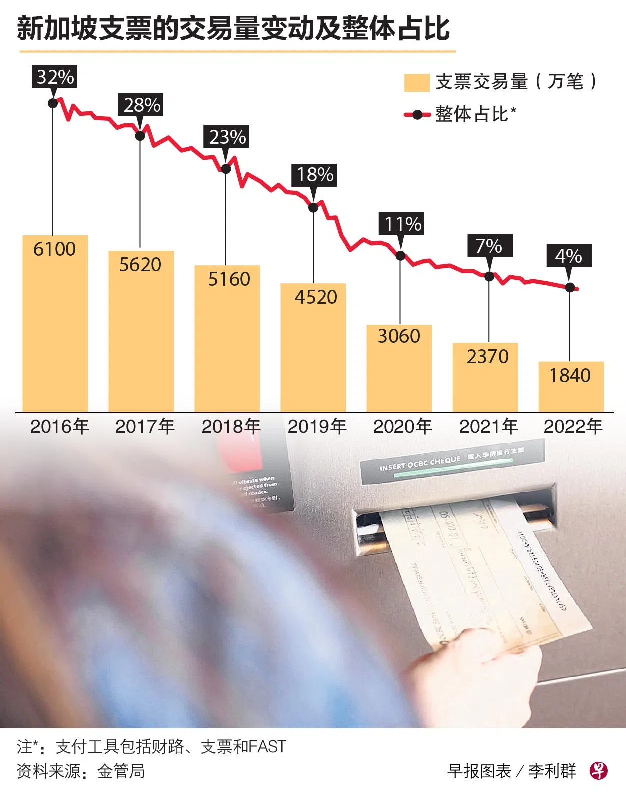 由于企业和个人越来越常使用电子支付,支票交易量不断减少,从2016年的6100万笔降至2022年的1840万笔,减幅近70%。支票、即时付款清算网络FAST,以及财路(GIRO)三大付款方式的合计交易量当中,支票所占的比重过去七年不断下跌,去年降至4%。