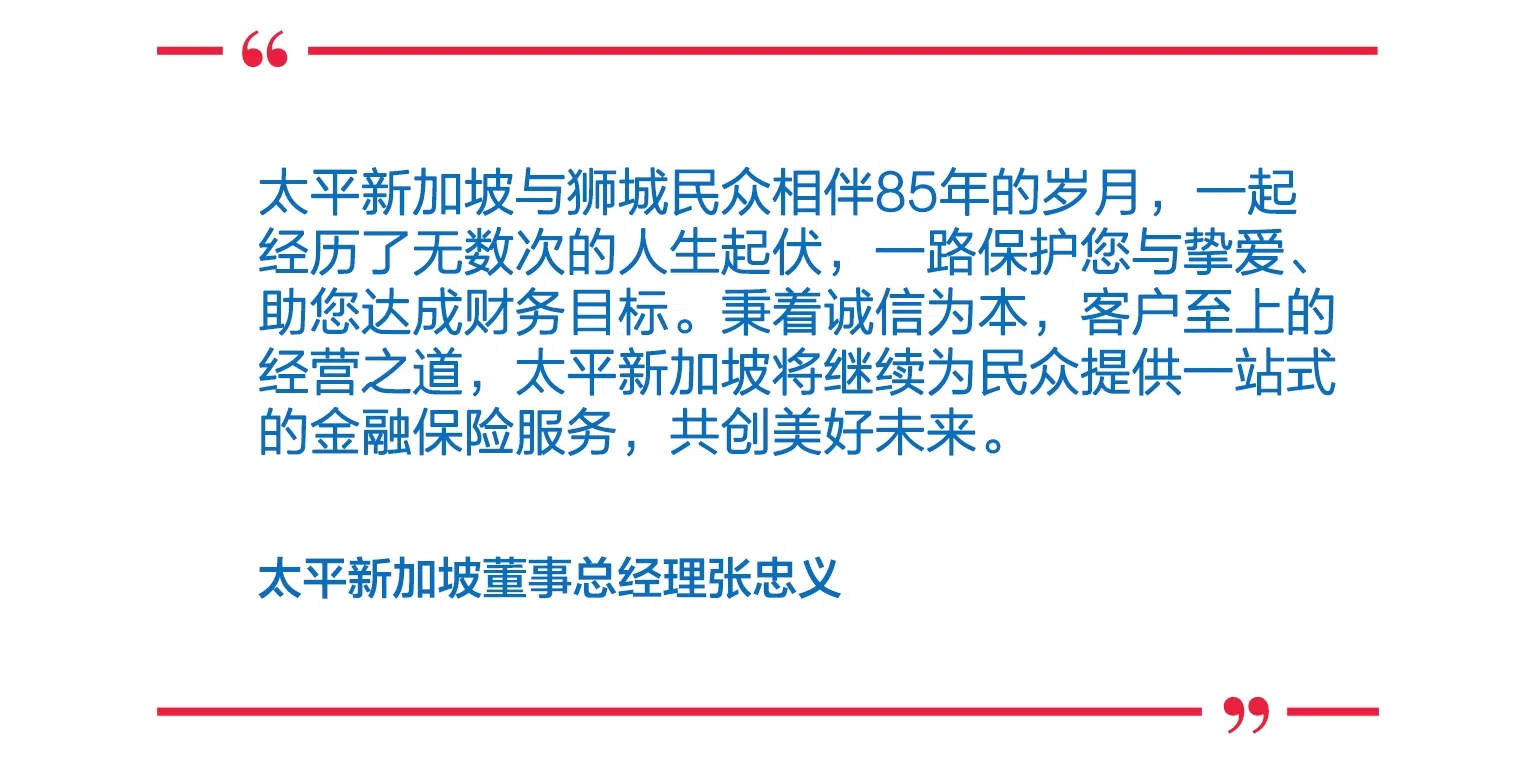 从创立初期只专注于产业保险,到如今产寿兼营,实现险种全覆盖;从二战爆发夹缝中顽强存活,到成为中国太平保险集团东南亚区域中心,再到助力“一带一路”,不断拓宽贸易领域……85年间,带着励志与创新的DNA,太平新加坡为新加坡企业、中资公司及中新两国经贸往来提供广泛的保险保障服务,为新加坡社会经济稳定与发展保驾护航。