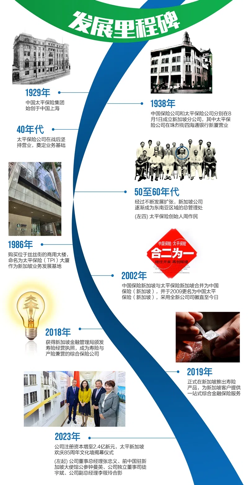 1938年,中国太平保险集团开始在新加坡设立全资子公司,以扎根新加坡、服务新加坡为宗旨,为新加坡社会提供优质专业的保险服务。2002年,中国保险新加坡分公司和太平保险新加坡分公司合并重组,并于2009年更名为中国太平保险(新加坡)有限公司(简称“太平新加坡”)。