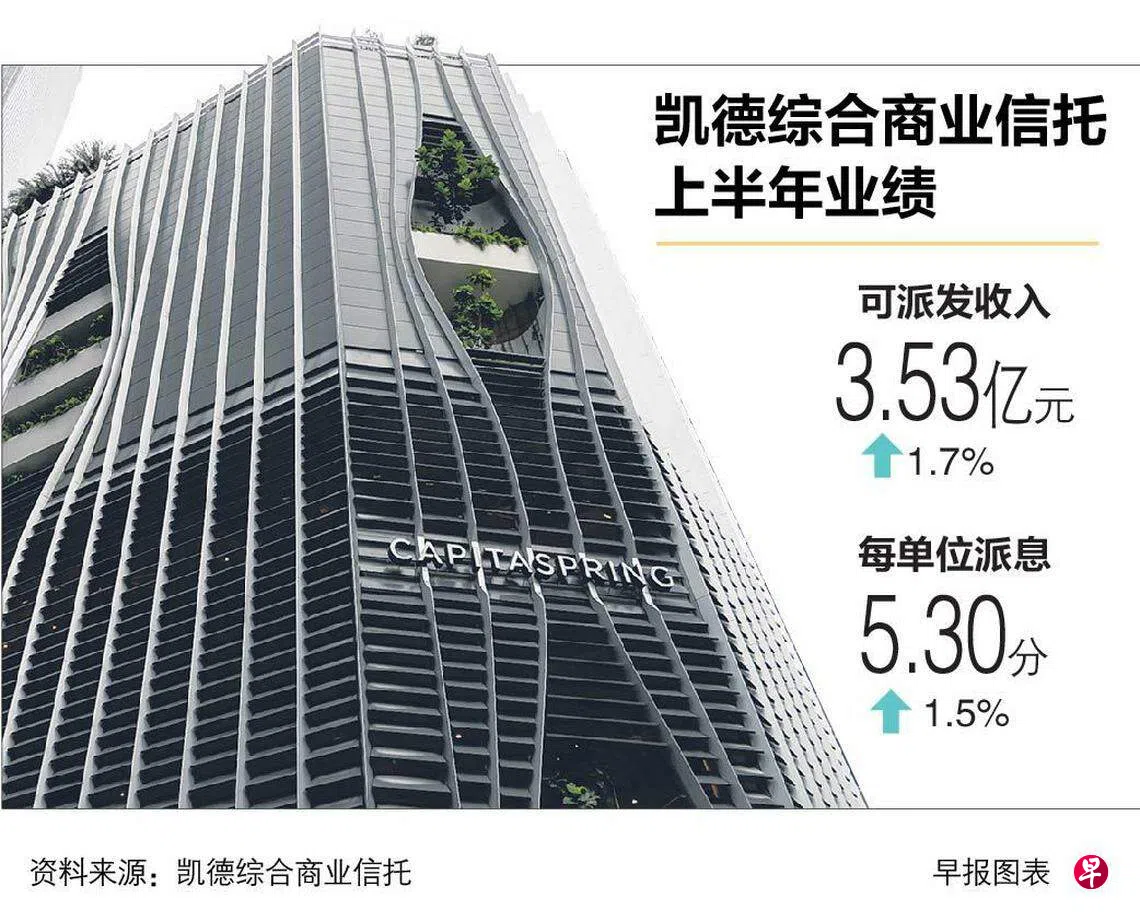 凯德综合商业信托(CICT)今年上半年每单位派息同比增长1.5%至5.30分,可派发收入也同比上升1.7%至3亿5325万元。
