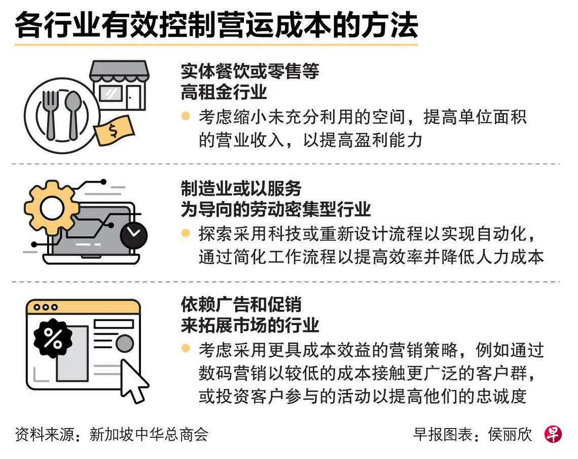 答:新加坡中华总商会中小企业首席商务顾问李丽施接受《联合早报》采访时说,中小企业的运营成本因行业而异,主要相关的运营成本包括人工、原材料、租金、市场营销和物流等。在目前数码化的推动下,网络和系统安全也已成为许多中小企业运营开支的一部分。