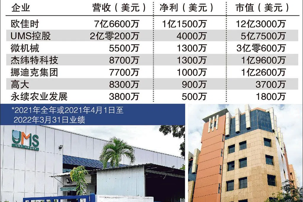 上榜的三家市值最大的本地公司是欧佳时(The Hour Glass,市值11亿9000万美元)、UMS控股(UMS Holdings,5亿3700万美元),以及富旺朝控股(Food Empire,1亿9900万美元)。