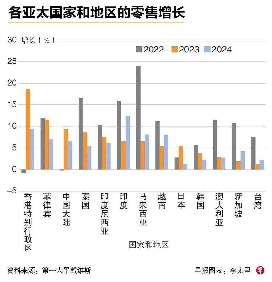 第一太平戴维斯(Savills)最新发布的亚太区零售领域报告指出,澳大利亚和新加坡等主要亚太经济体的物价上涨压力仍接近10年高位,限制了消费者的购买力。因此,除了受益于低比较基础的日本、中国大陆和香港,亚太区今年的零售销售增长应该会放缓。