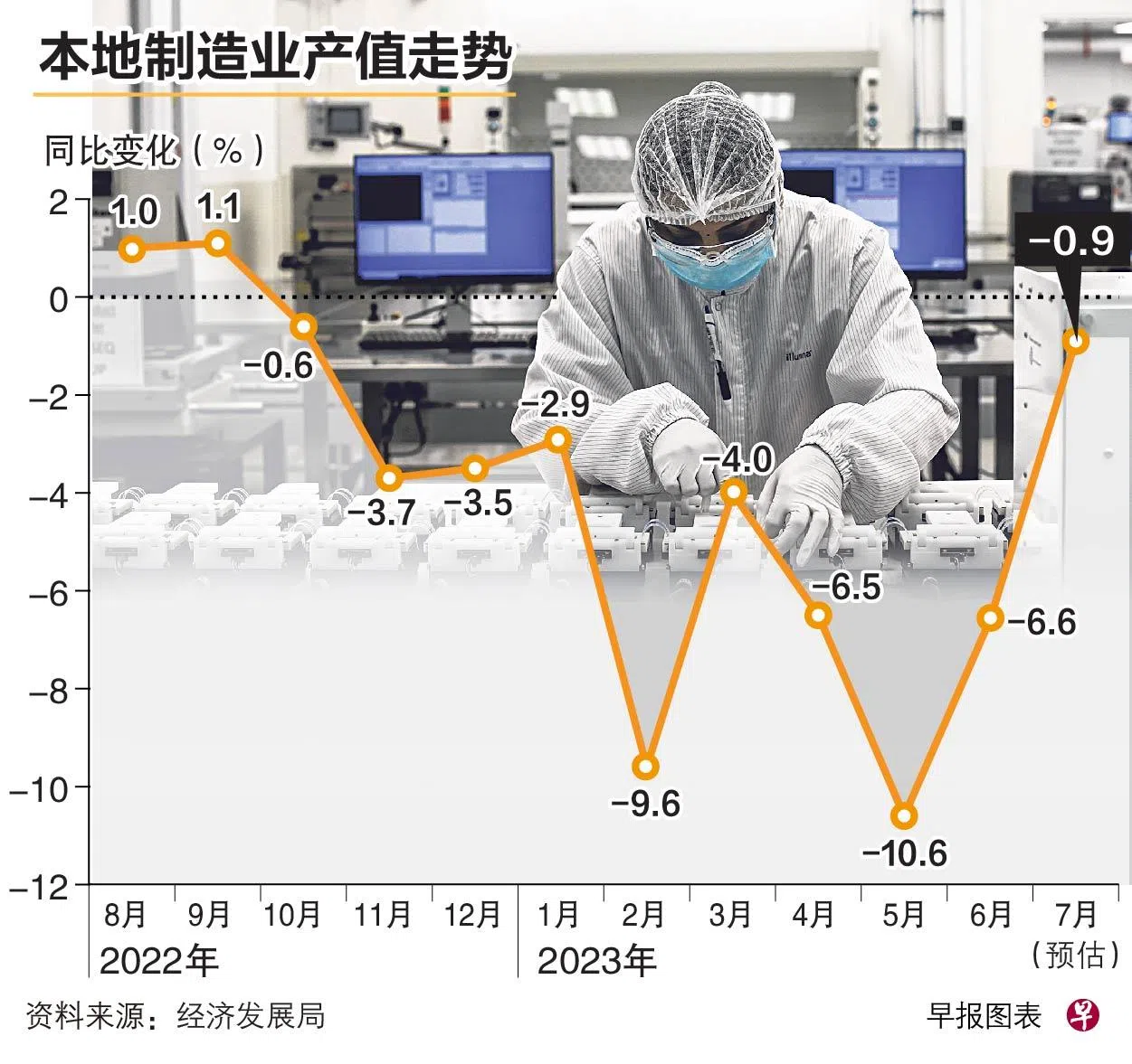 经济发展局星期五(8月25日)发布的预估数据显示,不包括生物医药领域,7月制造业产值同比增长1.7%,逆转前一个月5.1%的跌幅。