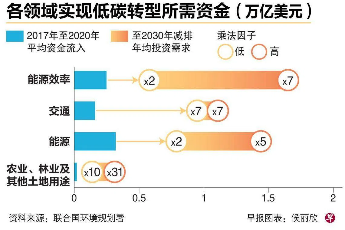 根据联合国环境规划署去年发布《2022年排放差距报告:正在关闭的窗口期——气候危机急需社会快速转型》,全球低碳转型每年需要至少4万亿至6万亿美元(逾8万亿新元)的投资。