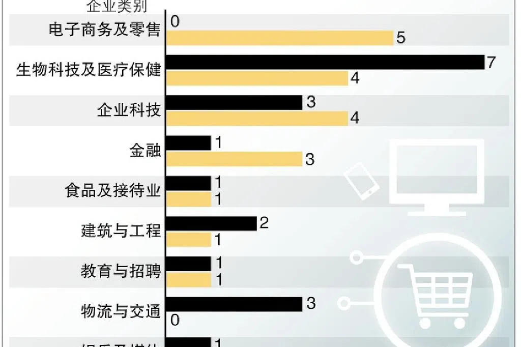 我国在企业科技类别有最多公司上榜,共有九家,去年只有四家。而去年上榜最多的电子商务及零售类别,今年则没有公司上榜。生物科技及医疗保健公司的数量维持在四家。金融业上榜公司比去年多一家上榜,共有四家。