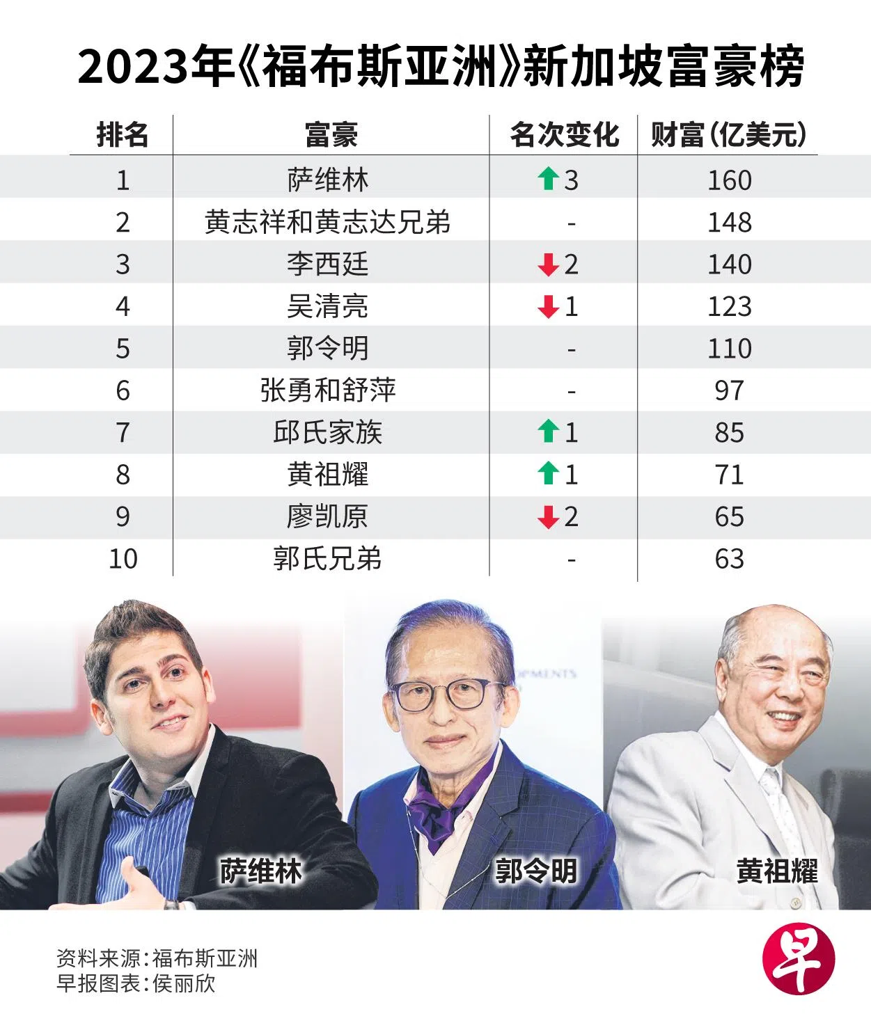 保住第二位置的是远东机构(Far East Organisation)的黄志祥和黄志达兄弟,他们的身家从去年的152亿美元,略微下滑至148亿美元。兄弟曾在2010年至2018年,连续九年蝉联新加坡首富。