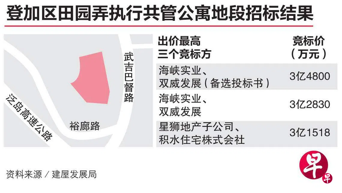 位于登加区田园弄的执行共管公寓(EC)地段招标结果出炉,由海峡实业(Hoi Hup Realty)和双威发展(Sunway Developments)组成的财团以3亿4850万元标得,标价相当于容积率每平方英尺703元,再创EC土地价格新高。