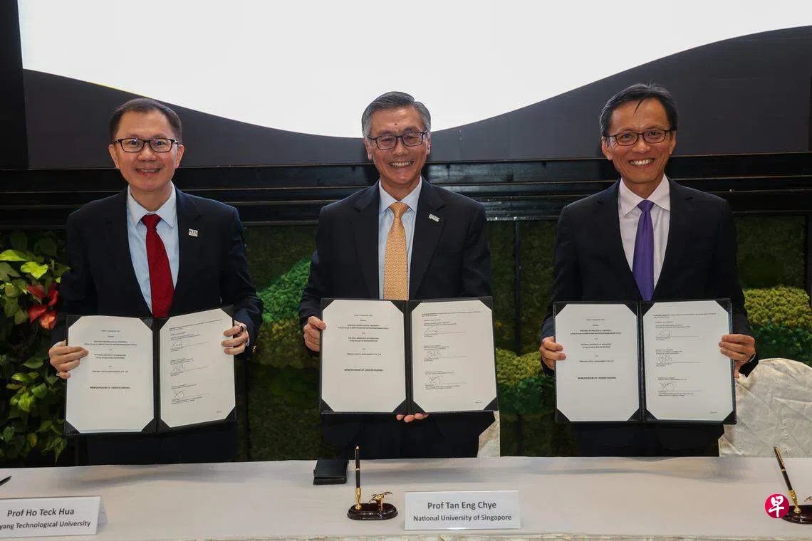 淡马锡星期二(9月12日)与新加坡国立大学和南洋理工大学在淡马锡店屋签署合作谅解备忘录,目标是每年至少成立两家精深科技起步公司,三方将为这些起步公司提供创业指导、资金和支持,协助它们在全球取得长期成功。