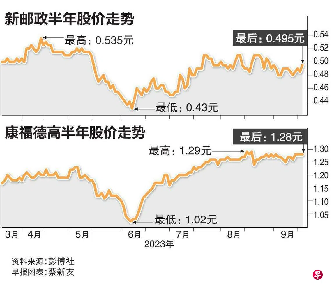 新邮政星期二股价一度大涨5.15%至0.51元,闭市时涨幅收窄至2.06%,收报0.495元,全天交易量是平时的近四倍;康福德高的股价则一度涨1.56%至1.30元,最终收平于1.28元,交易量一般。