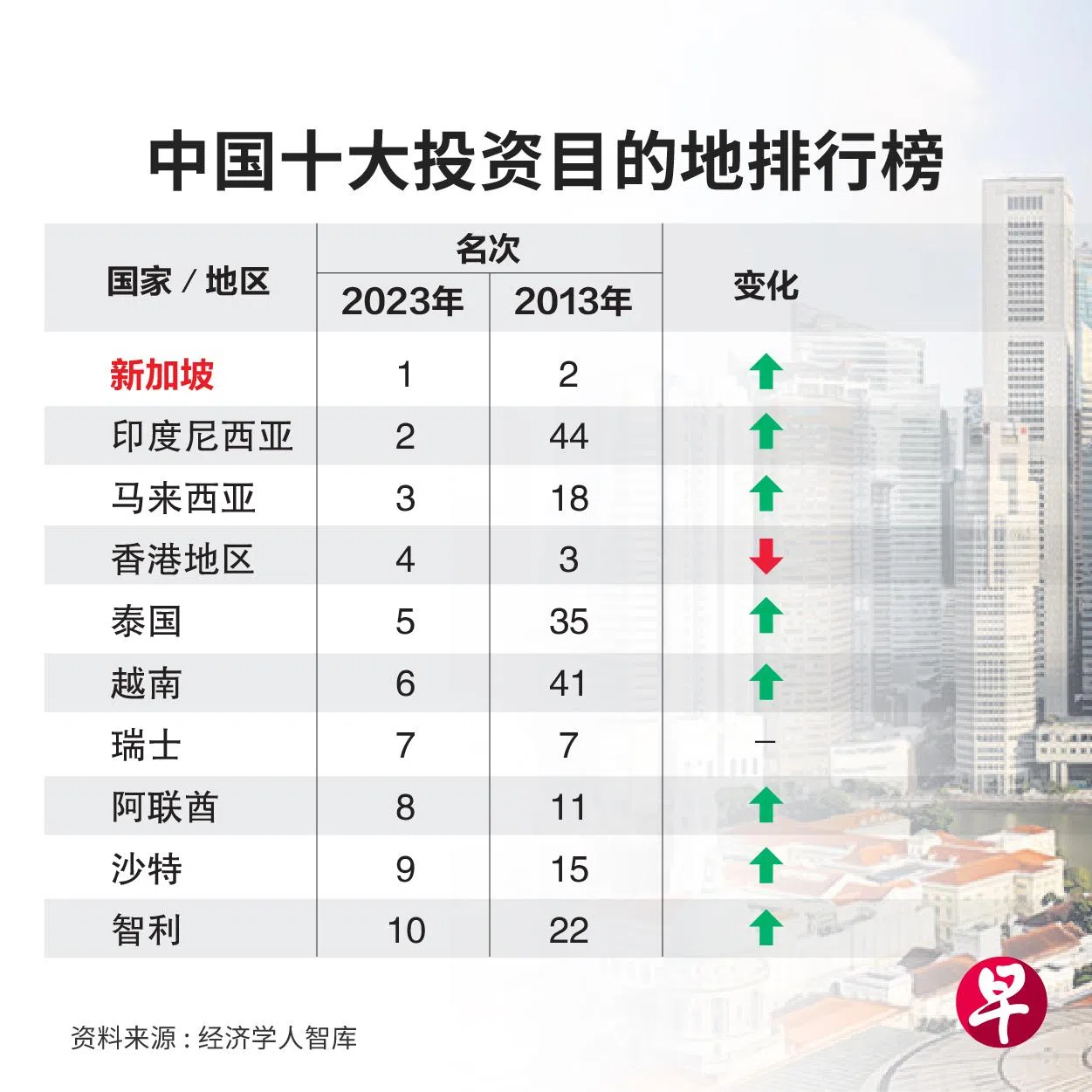 根据这项研究之前的数据,新加坡在2017年首次超越美国,成为中国对外投资最佳目的地。