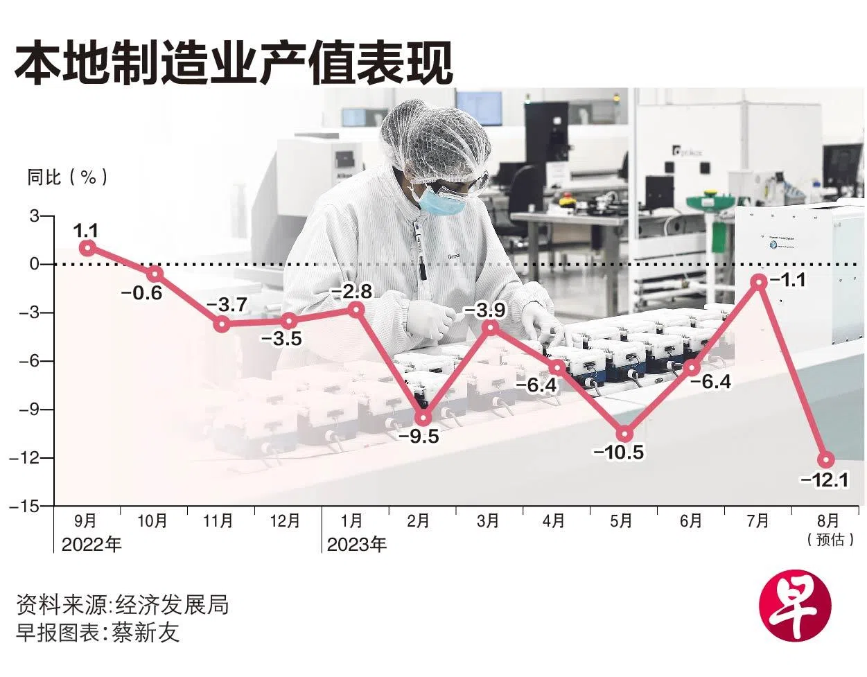 经济发展局星期二(9月26日)发布的预估数据显示,8月份制造业产值的12.1%同比跌幅,大于7月份的1.1%跌幅,也是自2019年11月以来的最大跌幅。