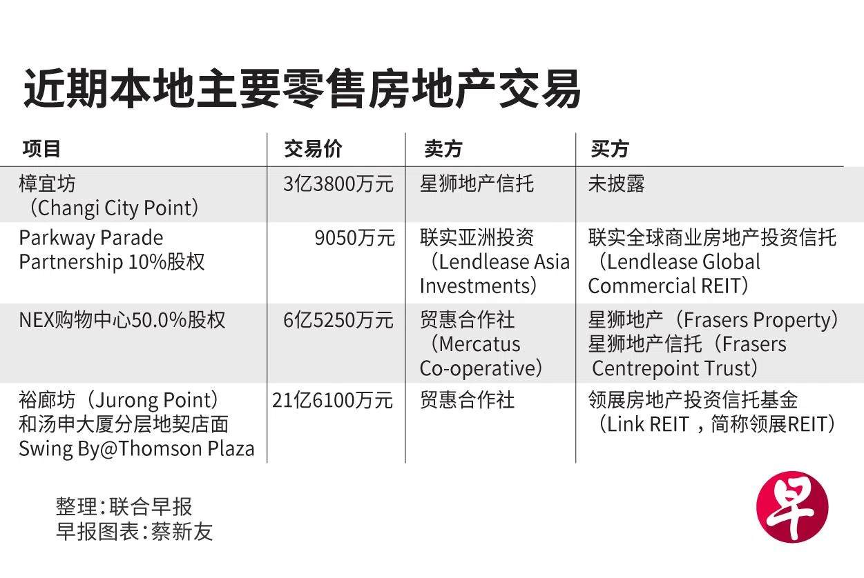 新加坡零售房地产交易近来颇为活跃。如8月时,星狮地产信托宣布以3亿3800万元出售樟宜坊(Changi City Point)给不相关的第三方。此外,联实全球商业房地产投资信托(Lendlease Global Commercial REIT)6月宣布以9050万元收购Parkway Parade Partnership的10%股权。该公司间接持有百汇广场(Parkway Parade)77.09%的股权。