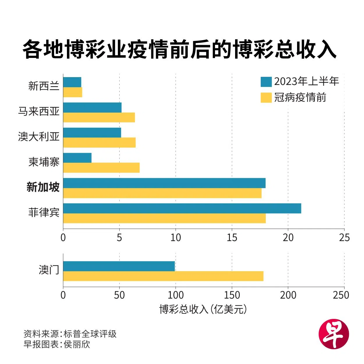 标普全球评级分析师朴梭恩(Shawn Park)接受《联合早报》访问时说:“我们根据滨海湾金沙和云顶新加坡的收入计算博彩收入。新加坡整体今年第一季和第二季的总博彩收入分别为8亿4900万美元和9亿5000万美元。我们预计疫情前的总博彩收入每季平均为8亿8100万美元。 ”
