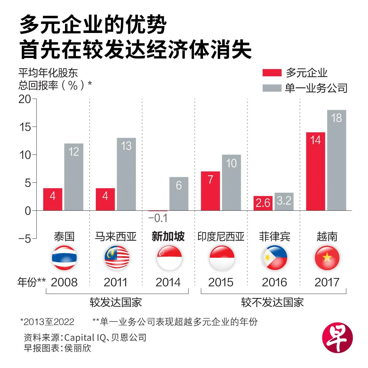报告指出,东南亚的多元企业当时蓬勃发展属于异常情况,因为在较发达市场中,专攻某个行业并在里面取得领导地位的企业表现通常更好。