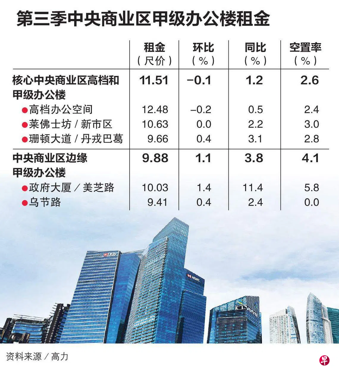 房地产咨询公司高力(Colliers)星期一(10月9日)发布的《第三季新加坡办公楼市场报告》显示,核心中央商业区的高档和甲级办公楼租金下降,特别是珊顿大道和丹戎巴葛的高档办公楼。但因市场供应有限,核心商业区核心甲级办公楼租金维持不变。