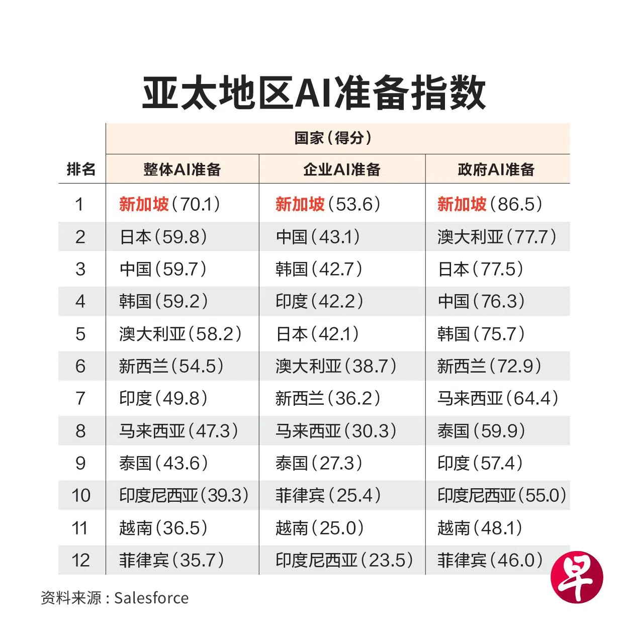 互联网服务公司Salesforce最新发布的2023年亚太地区AI准备指数报告,通过15个关键指标,衡量了12个亚太国家的企业和政府在AI领域的准备程度。新加坡在整体AI准备方面排名第一(得分70.1),领先其他11个经济体。日本(59.8)和中国(59.7)分别排名第二和第三。