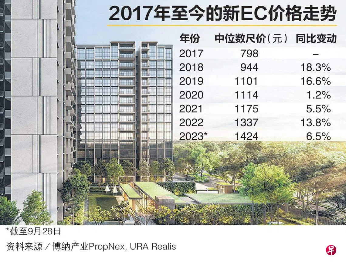 根据博纳产业(Propnex)提供给《联合早报》的数据,新EC的中位数尺价已从2021年的1175元,涨至截至今年9月28日的1424元,累积涨幅超过20%。如果跟2017年的中位数尺价798元相比,这几年来新EC价格上涨了78.4%。