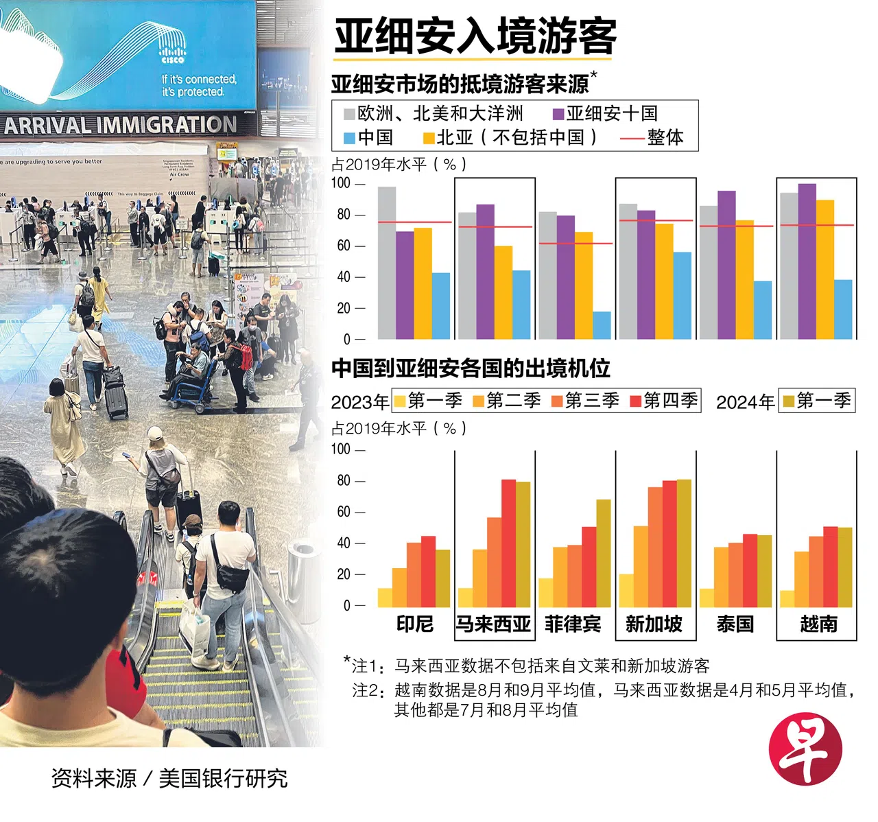 由于中国游客出境复苏恢复缓慢,抵境亚细安的游客人数只恢复到疫前的四分之三。不过,新加坡的情况相对较好,抵境游客人数已恢复到疫前的近80%。