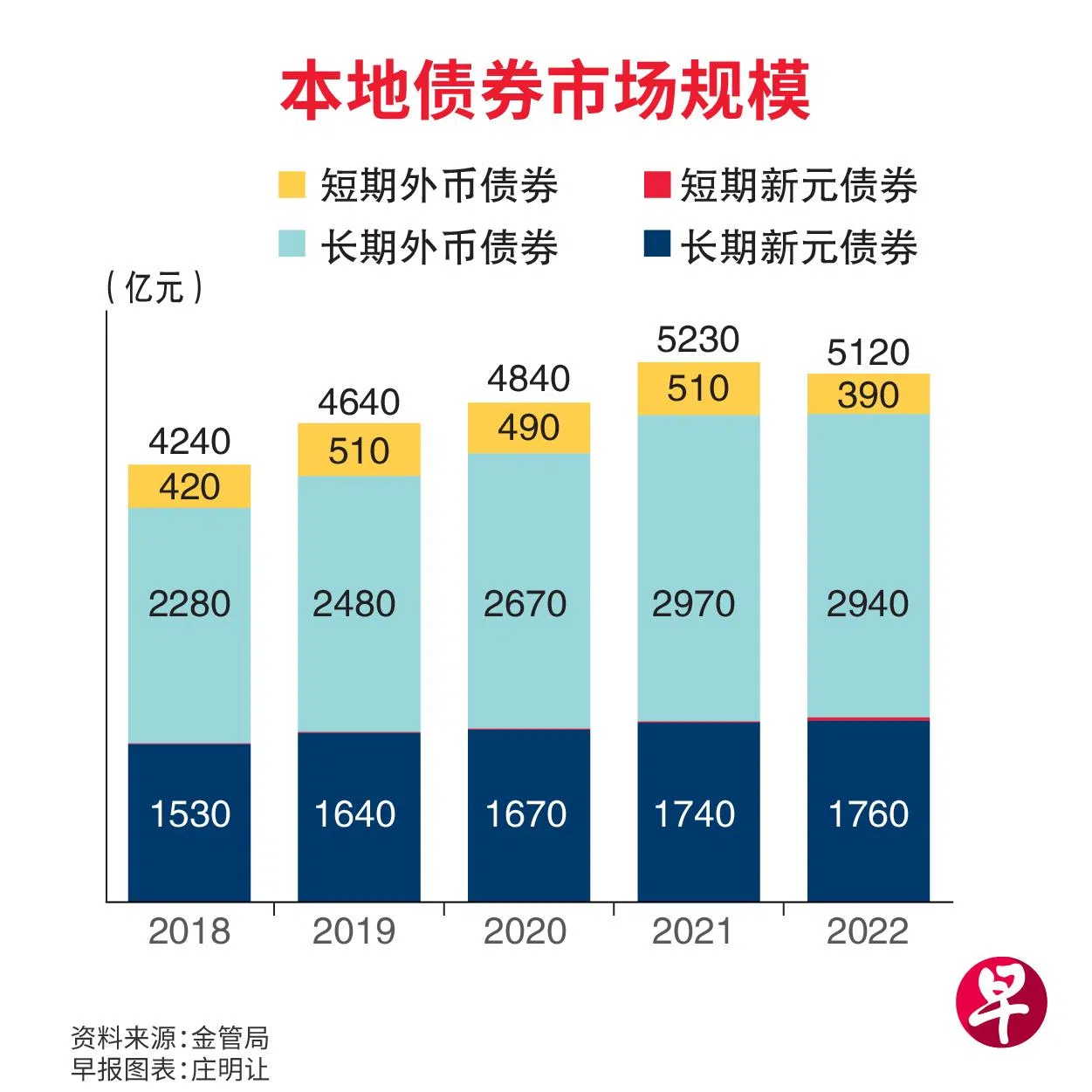 金管局报告显示,本地债券市场依然以美元债券为主,占了73.4%,其次是新元(15.3%)和欧元(2.6%)。