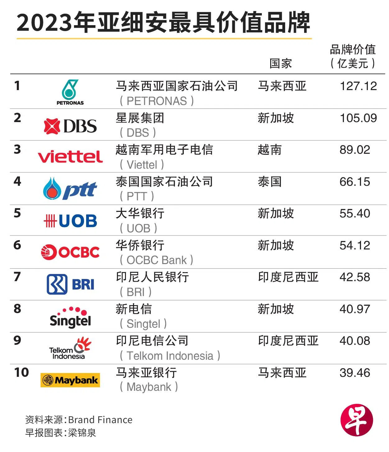 有53个新加坡品牌进入300强榜单,在最具价值的前十个品牌中,新加坡品牌占据四席,分别是排行第二的星展集团(DBS)、第五的大华银行(UOB)、第六的华侨银行(OCBC Bank)和第八的新电信(Singtel)。第一名由马来西亚国家石油公司(PETRONAS)摘得。
